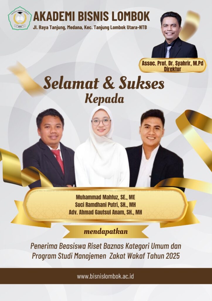 Lombok Utara – Dosen Akademi Bisnis Lombok (AKBIL) kembali menorehkan prestasi membanggakan di bidang riset dengan terpilih sebagai penerima Beasiswa Riset BAZNAS Tahun 2025 dalam dua kategori sekaligus, yaitu kategori Umum dan Kelompok. Rabu, 05/11/2025.